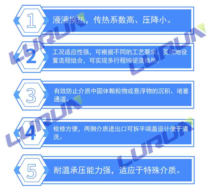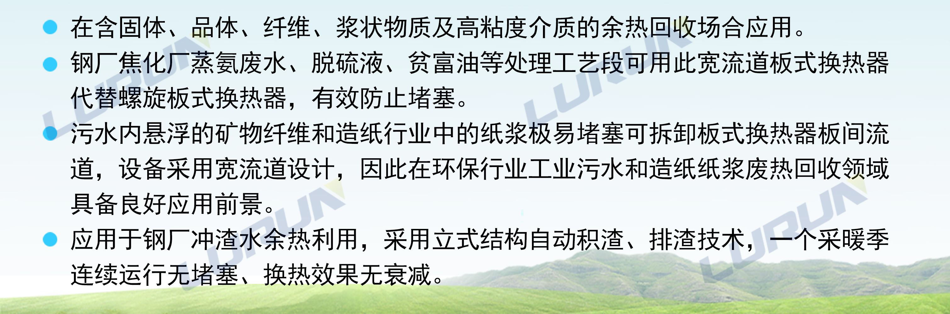 寬流道全焊接板式換熱器采用泡點板片形式,板片之間形成介質流道,板片周邊通過氬弧焊焊接密封。由于板片結構的特殊設計,使傳熱效率及壓力損失優于同工況條件下其它形式的熱交換設備,寬間隙流道內流體流動順暢、無滯留、無死區,可有效防止流道堵塞,流速設計合理減緩磨蝕現象發生。它吸取了國內外同類產品的諸多優點,既保留了板式換熱器傳熱效率高、體積小、使用壽命長、便于檢修等優點,又解決在復雜領域內取熱難的技術壁壘,并在相關工藝過程中取代了螺旋板式換熱器,是現如今換熱領域內一種合理匹配的特殊換熱器。